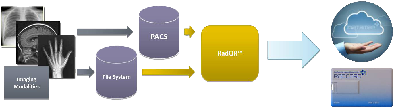 Although RadCard™ is completely self-contained and can pull imaging data from a local system, the RadQR™ package is more efficient, offers seamless integration with the radiology workflow and allows much greater connection and search capabilities across medical environments allowing for a universal adoption.
