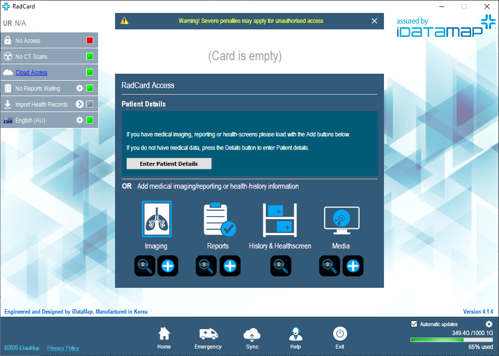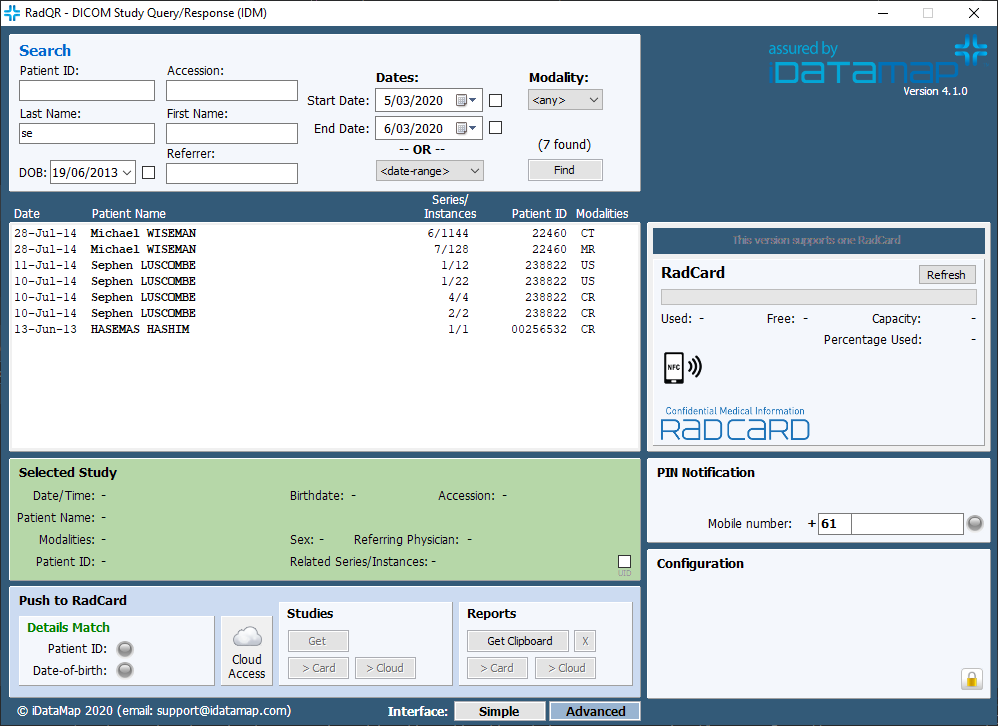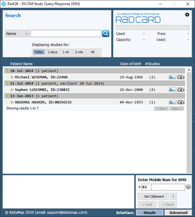 Selected studies can then be extracted (both DICOM image studies and their corresponding radiology reports) and channelled to RadCard™ and/or iDataMap’s cloud-based repositories. RadQR™ will be the process that most Radiology practices will use to load image data onto the RadCard™.  RadQR™ has powerful functionality to search, select (including multiple studies), validate patient identify and load images onto RadCard™. RadQR™ requires the installation of the software application onto the PACS network. Contact the Distributors in your location to arrange installation and training.